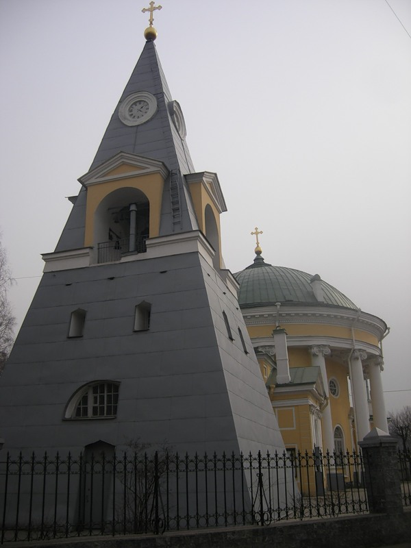 Эта очень интересная по своей архитектуре церковь, была построена в 1785 году. Проект разработан Н.А.Львовым. Стоит она в загородной усадьбе А.А. Вяземского, екатерининского вельможи, в селе Александровском. Теперь это место считается чертой города. Свое «сладкое» название «Кулич и Пасха» церковь